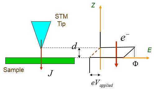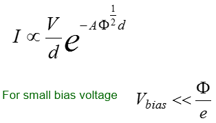 1. A slight change of distance between the tip and sample surface as shown in Figure 20.06 causes the current to decrease exponentially. For example: in the case I = 2 nA, V = 100 mV, d = 0.7nm; when d decreases by 0.1 nm (15% lower), V is set constant, then one achieves I = 10 nA (4 times greater).