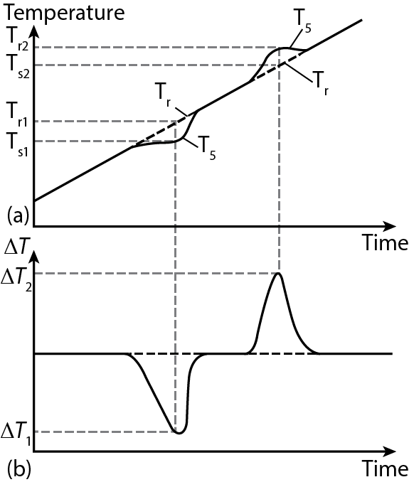 • The temperature measured as a function of time using the separate thermocouples for sample, reference and differential thermocouple are shown in Figure 21.02(a) and (b), respectively.
