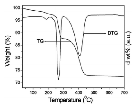 Figure 23.06 displays three step weight loss of the synthesized hydrozincite. Step 1: ~ 4% weight loss in the temperature range of 30 - 250°C due to moisture, trapped carbon dioxide, and ammonia removal.