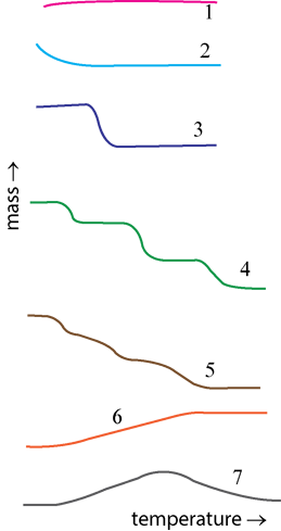 TGA curves are typically classified into seven types according to their shapes. Figure 23.03 shows schematic of various types of TGA curves.