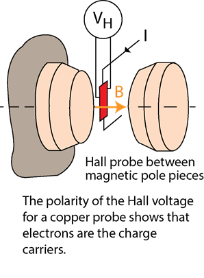 A thin film Hall probe as shown in Figure 26.02 is placed in the magnetic field and the transverse voltage (on the order of microvolts) is measured.
