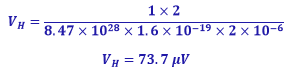 For a given hall probe of 2 μm thickness, the applied current of 1 ampere and magnetic field of 2 Tesla (n = 8.47e28 electrons/m3) yields the Hall voltage of
