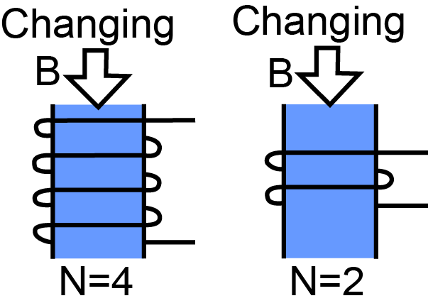 Figure 29.01 shows typical arrangement of changing magnetic flux in the circuit. By taking Δ(BA)/Δt as 4 Tm2/s; the increase in the number of turns helps to increase the magnetic field strength. With increasing the N from 2 to 4, the e.m.f. induced in the circuit (ξ) increases from 8 volts to 16 volts.