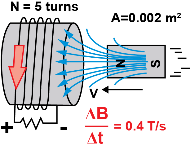 Figure 29.02 displays the typical arrangement of a magnet moving towards or away from the coil. Let us assume that ΔB/Δt as 0.4 T/s, A as 0.002 m2 and N as 5 turns in the coil, then the voltage induced in the circuit is determined to be: