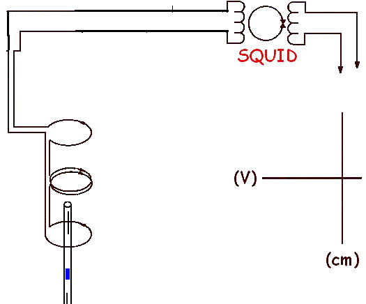 This coil together with a SQUID antenna (red in right figure 30.09) is part of a whole circuit transferring the magnetic flux from the sample to an rf SQUID device which is located away from the sample in the liquid helium bath. This device acts as a magnetic flux-to-voltage converter (blue in above figure 30.09). This voltage is then amplified and read out by the magnetometer's electronics (green part).
