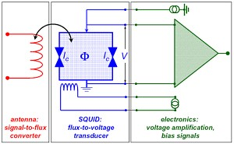 Figure 30.09: (left) Movement of samples in second order gradiometer and output signal [3], and (right) typical circuit of SQUID.