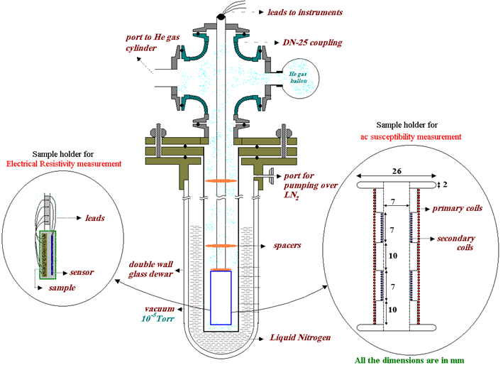 Figure 31.01 displays the typical setup constructed for measuring AC susceptibility and electrical resistivity using a glass cryostat in the temperature range 80 K to 400 K.