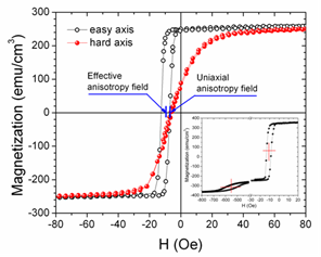 Figure 31.03: M-H loops of Ta(3)/ NiFe (10)/ Cu(1.5)/ NiFe (2)/ IrMn (10)/Ta(3) (nm) characterized in easy and hard axis [3].