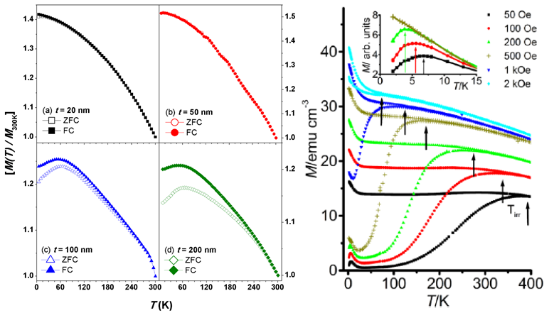 Figure 31.06: Low temperature M-T data for (left) FeTaC (t nm) [6]; and (right) BFO (50 nm) film [7].
