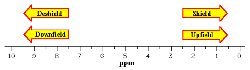It is convenient to describe the relative positions of the resonances in an NMR spectrum. For instance, as shown in Figure 35.07, a peak at a chemical shift, δ, of 10 ppm is said to be downfield or deshielded with respect to a peak at 5 ppm. Otherwise, the peak at 5 ppm is upfield or shielded with respect to the peak at 10 ppm.