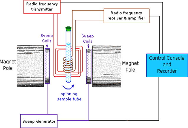 The basic arrangement of NMR spectrometer is shown in Figure 35.04. The sample is positioned in the applied magnetic field using electromagnet and microwaves are used in the radio frequency input circuit to excite the sample and to induce transitions between different nuclear spin states. This induces a radio signal in the output circuit, which generates an output signal.