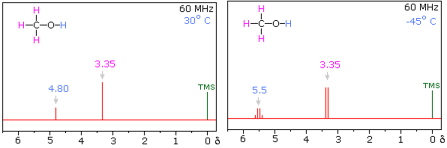 Figure 35.06:: NMR Spectra of pure methonal at 30°C (left) and -45°C [1].