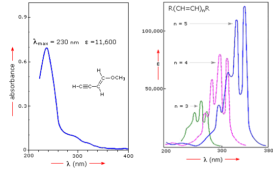 UV-VIS spectrum also helps to understand the importance of conjugation. For example, the spectrum shown left of Figure 37.08 illustrates that conjugation of double and triple bonds, which shift the absorption maximum to longer wavelengths. From the polyene spectra displayed in the right diagram, it is clear that each additional double bond in the conjugated pi-electron system shifts the absorption maximum about 30 nm in the same direction.