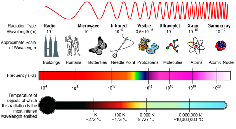 Figure 37.01: Diagram of electromagnetic spectrum and various properties across different frequencies and wavelengths.