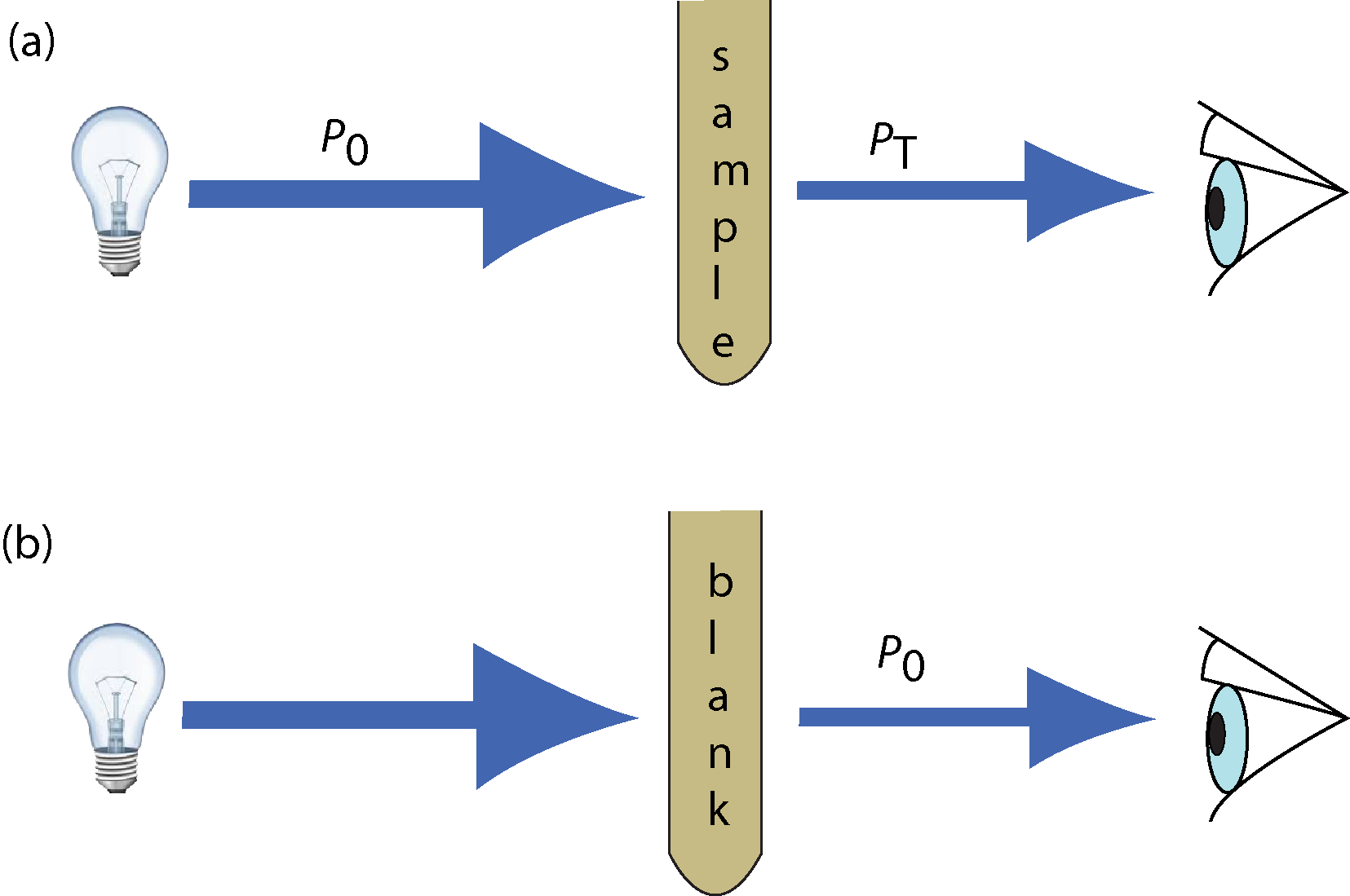 Figure 37.04: Schematic diagram showing the radiation passing through a sample; P0 is the radiant power from the source and PT is the radiant power transmitted by the sample. (b) Schematic diagram of light passing through a blank holder with the radiation defined as P0 .