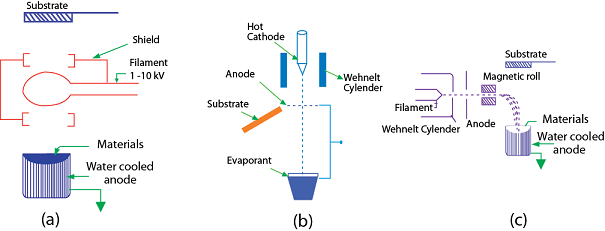 2. Self accelerated: Electrons are emitted from hair-pin type of filament and focused through Wehnelt-cylinder on the material (see Figure 40.1b) to evaporate and deposit films.