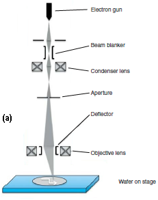 Figure 40.3 shows the schematic diagrams of a simple e-beam column (a) and more complete column (b) of a EBL system. It consists of an electron source (or gun) at top, some probe forming optics, a beam blanker, a condenser lens to allow changes in the current and corresponding beam diameter, an objective lens to focus the beam on the wafer, and a deflector to scan the e-beam around.