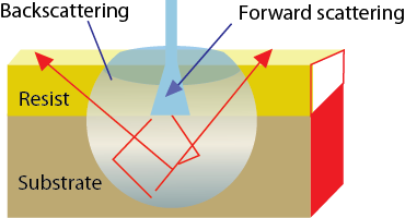 Figure 40.4: Illustration of the short-range (forward-scatter) and long-range (backscatter) interaction of electrons with resist-coated wafer.