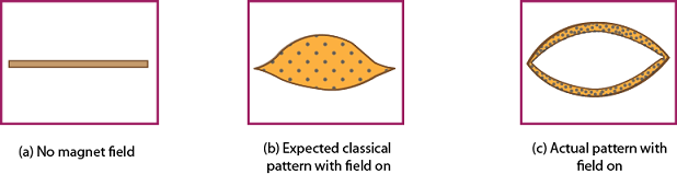 A narrow beam of neutral atoms coming from an oven, after passing through collimating slits, is allowed to pass through a non-uniform magnetic field directed along the z-axis and finally fall on a collecting plate. The non-uniform magnetic field is produced by specially designed pole pieces of an electromagnetc as shown in Figure 2.1(b). The upper pole piece is in the form of a knife edge and the lower one has a channel cut in it parallel to the knife edge. This provides a field gradient in the z-direction. When no magnetic field is applied, the beam produces a single trace on the collecting plate as shown in Figure 2.2(a). On the other hand, the trace splits distinctly into more than one trace after switching on the field. In order to understand the observed behavior, we shall first focus on the theory of the experiment.