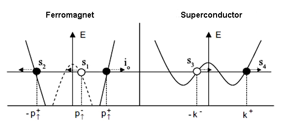 Figure 19.2: Schematic diagram of excitation energy versus momentum at FM – SC interface. Open circles denote holes; filled circles represent electrons, and arrows point in the direction of the group velocity. It demonstrates an incident electron at io, along with the reflected (S1, S2) and transmitted (S3, S4) particles.