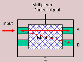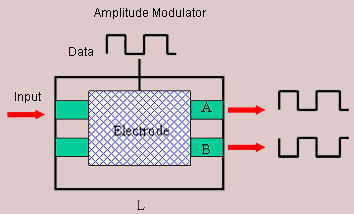 By using the same lay out as used for the amplitude modulator, we can realize an optical switch. Instead of data if apply the control voltage to the electrode, the output at any port can be switched ON or OFF. Of course the two outputs are complement of each other, so when one port is OFF the other will be ON and vice versa. |
