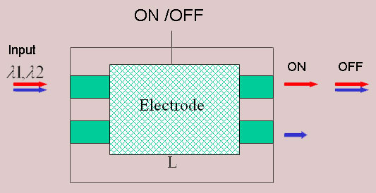 The principle is similar to that of the optical switch except now the coupling is wavelength dependent. So if we design a coupler such that when no voltage is applied to the device, the coupler length is even multiple of coupling lengths at both wavelengths, whereas when the voltage is applied, the coupler length becomes even multiple of the coupling length of one wavelength but odd multiple of coupling length for the other wavelength. The two wavelengths will then appear at the two ports at the output.
