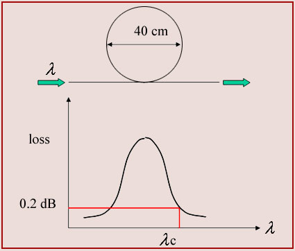 As the wavelength increases, the higher order mode approaches cut-off and its energy spreads in the cladding. Due bending loss, this mode looses the power, so the power which reaches to the output is only the power with the first mode. The output then shows a higher loss. |