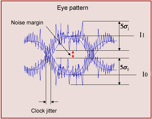 The eye diagram gives the mean levels corresponding to the bit-0 and bit-1. Assuming that the noise is Gaussian, the peak to peak amplitude of noise is approximately . From the diagram therefore we can measure and subsequently the parameter Q.