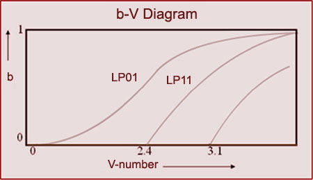 The relation can be equivalently described by b-V relation. The b-V diagram of a step index optical fiber for different modes is shown in the following.