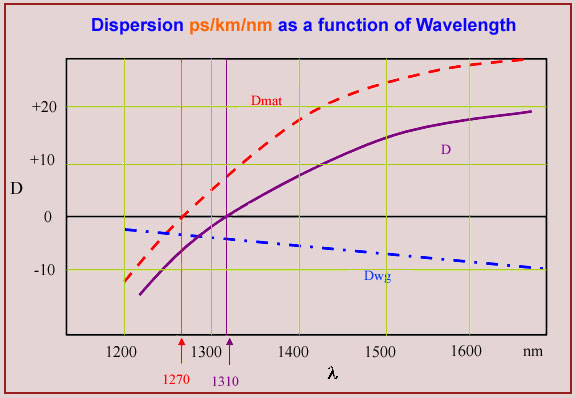 Note: The material dispersion is zero at 1270nm. However, in a single mode fiber, we always get dispersion which is a combination of material and waveguide dispersion. Therefore