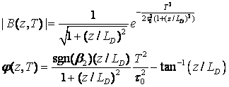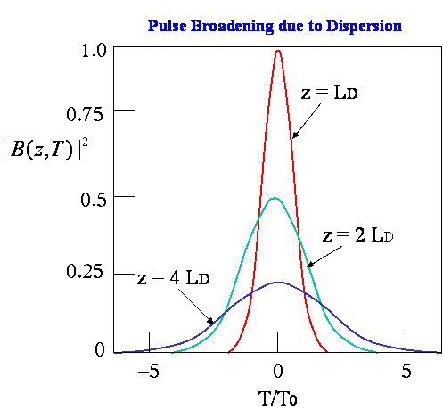 The shape of the Gaussian pulse remains Gaussian as the pulse travels along the fiber in dispersive regime. However, the pulse width increases with distance. Over a distance z, the pulse width is . It should also be noted that the pulse always broadens irrespective of the sign of . We can then see that the dispersion length is that distance over which the pulse width increases to times of its original value.