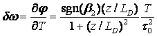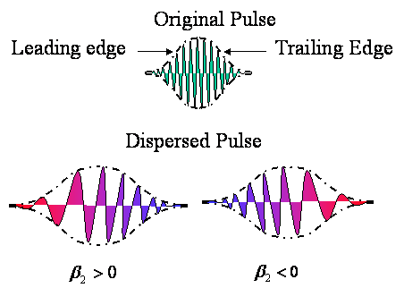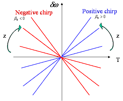 The frequency varies linearly as a function of time, T. It is then said that the pulse is linearly chirped. For positive , the frequency is higher on the trailing edge of the pulse and is lower at the leading edge of the pulse as shown in Fig. The reverse happens when is negative. If is negative the dispersion is called anomalous.