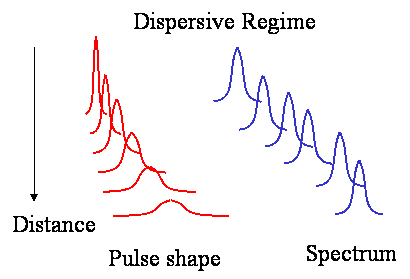 In Dispersive regime the pulse broadens but its spectrum remains same. Only different frequencies get separated in time due to dispersion, but there are now new frequencies generated as shown in Fig.