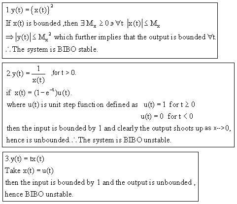 BIBO Unstable system: In a BIBO unstable system, there exists at least one bounded input for which output is unbounded. Again, nothing can be said about the system's response to an unbounded input.  |
