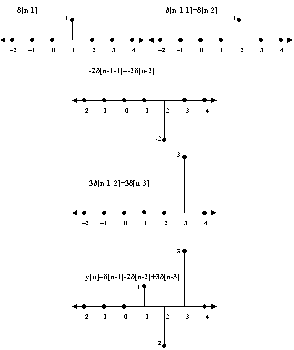 1. Thus, our input signal is as shown in the figure below. Then, we invoke the LSI properties of the system to get the responses to the individual signals: the first calculation is show above, while the calculation of response for