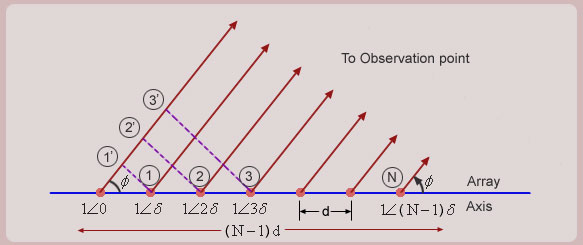 For a linear array, the antennas are placed along a line called the Axis of the array. The antenna elements in general could have arbitrary spacing between them and could be excited with different complex currents. However, here we analyze first the uniform array. |