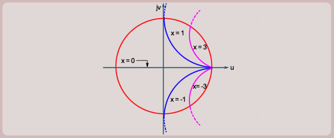 line passing through point (1,0) in the -plane. The constant reactance circles are shown in figure below for different