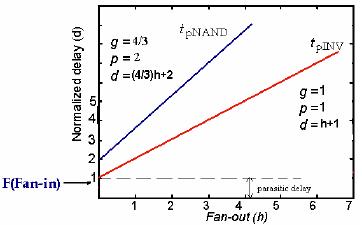 each line is the logical effort of the gate.It’s intercept is the parasitic delay. The graph shows that we can adjust the total delay by adjusting the electrical effort or by choosing a logic gate with a different logical effort.