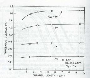 In case of long channel MOSFETs, gate has control over the channel and supports most of the charge. As we go to short channel lengths as seen in the graph above, the threshold voltage begins to decrease as the charge in the depletion region is now supported by the drain and the source also. Thus the gate needs to support less charge in this region and as a result, VT falls down.This phenomenon is known as charge sharing effect. |