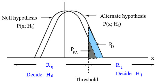 where α is termed as significance level or size of the test in statistics. Now there are many R1 that satisfy the above relation. Our goal is to choose the one that maximizes the probability of detection defined as: