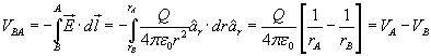 Further consider the two points A and B as shown in the Fig. 2.9. Considering the movement of a unit positive test charge from B to A , we can write an expression for the potential difference as: