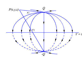 To apply the method of images, if we place an image charge -Q as shown in the figure 2.26, the system of two charges (essentially a dipole) will produce zero potential at the location of the conducting plane in the original problem. Solution of field and potential in the region