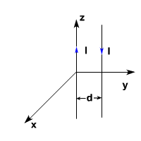 Determine the force per unit length between two infinitely long parallel conductors carrying current I in the opposite direction, this conductors being separated by a distance ‘ d ' as shown in the figure