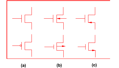 Chapter 1 introduced the MOS transistor as a switch. The present chapter first develops the fundamental physical characteristics of the MOS transistor, in which the electrical currents and voltages are the most important quantities. The link between physical design and logic networks can be established. Figure 2.1 depicts various symbols used for the MOS transistors. The symbol shown in Figure 2.1(a) is used to indicate only switch logic, while that in Figure 2.1(b) shows the substrate connection. |