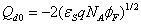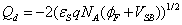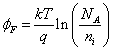 The factor 2 comes due to the fact that in the bulk, the semiconductor is p-type, where EI is above EF by where k: Boltzmann constant, T: temperature, q : electron charge NA : acceptor concentration in the p-substrate and n i : intrinsic carrier concentration. The expression kT/q is 0.02586 volt at 300 K. The applied gate voltage must also be large enough to create the depletion charge. Note that the charge per unit area in the depletion region at strong inversion is given by where |