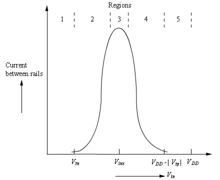 Let Vtn and Vtp denote the threshold voltages of the n and p-devices respectively. The following voltages at the gate and the drain of the two devices (relative to their respective sources) are all referred with respect to the ground (or VSS), which is the substrate voltage of the n -device, namely Vgsn =Vin , Vdsn =Vout, Vgsp =Vin -VDD , and Vdsp =Vout -VDD . The voltage transfer characteristic of the CMOS inverter is now derived with reference to the following five regions of operation : Region 1 : the input voltage is in the range |