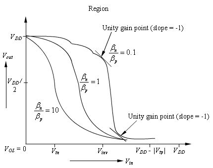 Figure 2.13 Variation of shape of transfer characteristic of the CMOS inverter with the ratio