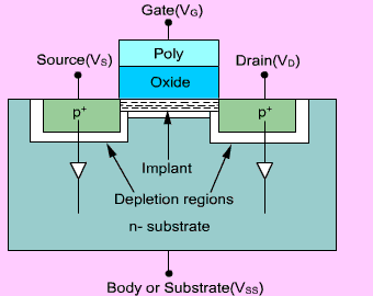 Figure 2.6 Structure of an pMOS enhancement mode transistor. Note that VGS < Vth , and VDS =0. |