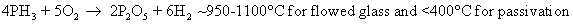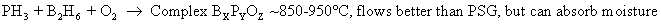 PSG (Phosphorosilicate Glass) and BPSG (Borophosphorosilicate Glass) are examples of doped oxides and are useful as filling layers. Doped Oxides (glasses) can be made to “flow” or smooth out. This is particularly useful for smooth interconnects (prevents sharp edges which tend to break metal lines) or for partial global planarization for subsequent lithography steps. The following reactions occur during doped oxide deposition.