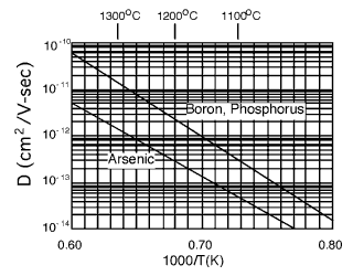 The temperature dependence is often shown graphically in an Arrhenius plot where the logarithm diffusion coefficient is plotted against 1/T . Such a plot will be a straight line with slope-Ea/k and intersects the log( D) axis in log(D0) . The Arrhenius plot of B, P and As in Si is shown in Fig.3.36. The D0 and Ea of a particular dopant can be determined experimentally by measuring the diffusion coefficient at different temperatures. The temperature dependency of the diffusion process is exploited for significant matter transport and usually the temperature is kept above 800°C for almost all dopants.